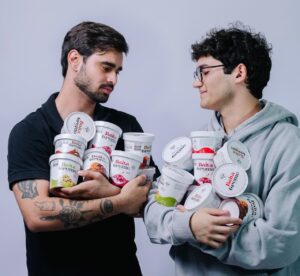 Os filhos Pedro e Enrico com os potes da Baita Creme Gelato, comercializados em oito sabores