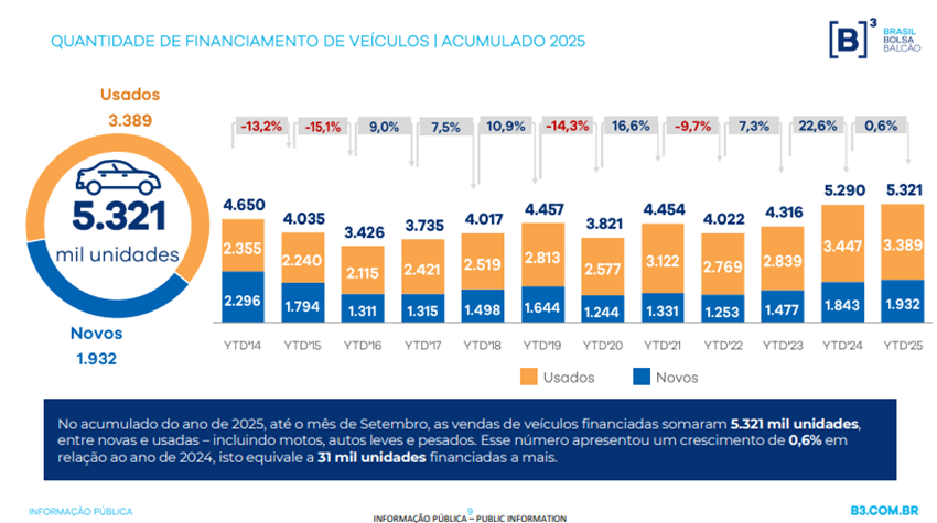 “O resultado histórico indica um crescimento consistente do setor. Este é o terceiro aumento consecutivo no acumulado de janeiro a setembro, o que reforça que a demanda por financiamento de veículo permanece forte este ano, mesmo diante das adversidades macroeconômicas”, afirma em nota Daniel Takatohi, superintendente de produtos de financiamentos da B3.