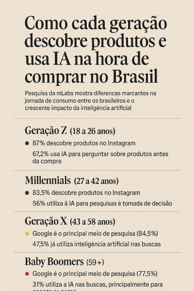 A jornada de compra no Brasil está passando por uma transformação silenciosa, porém profunda. A pesquisa “A Nova Jornada de Compra”, realizada pela mLabs em parceria com a Conversion, ouviu 800 consumidores em todo o país. Ela revela como diferentes gerações se relacionam com marcas, plataformas digitais e, especialmente, com as ferramentas de inteligência artificial.