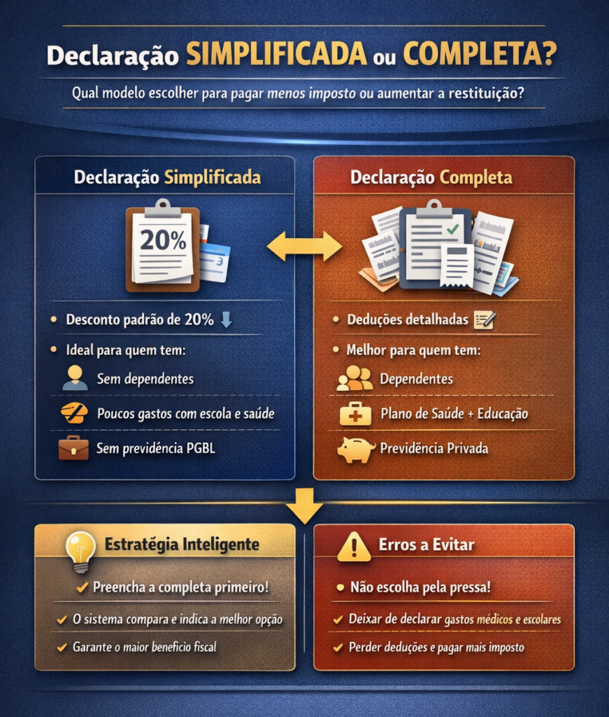 Já a declaração completa exige mais atenção no preenchimento, mas pode gerar economia significativa quando o contribuinte possui despesas que podem ser abatidas legalmente.
